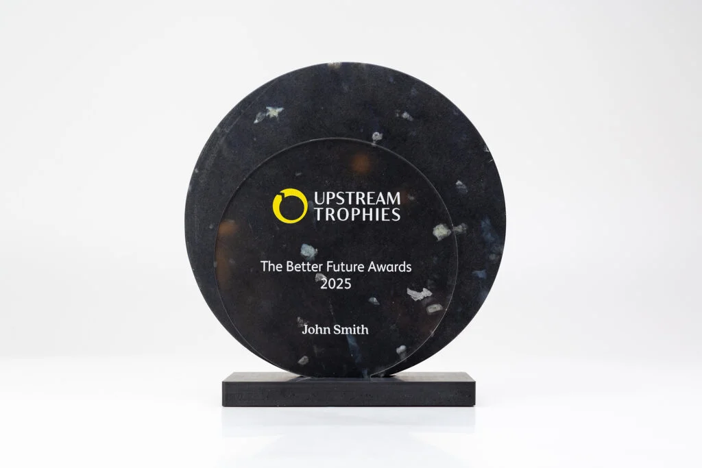 Rising above its base, the hero material captivates with the Dark Galaxy aesthetic, crafted from repurposed packaging. This black material is sprinkled with subtle glints, reminiscent of a starry night sky. Its creation from recycled materials not only emphasizes the importance of sustainability but also brings a piece of the cosmic wonder into the tangible form of an award, symbolizing the recipient’s stellar achievements and their part in preserving our planet.