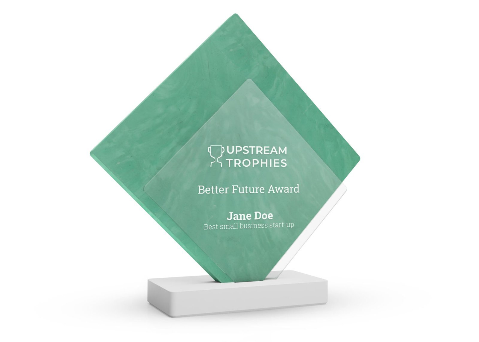 Discover the Rhombus Trophy: The Essence of Eco-Innovation, where sustainability and achievement merge. With its “Snowfall” base made from recycled packaging and a light green centerpiece from old fishing nets, this trophy offers a personalized touch through full-color customization on a recycled acrylic layer, embodying the beauty of eco-conscious success.